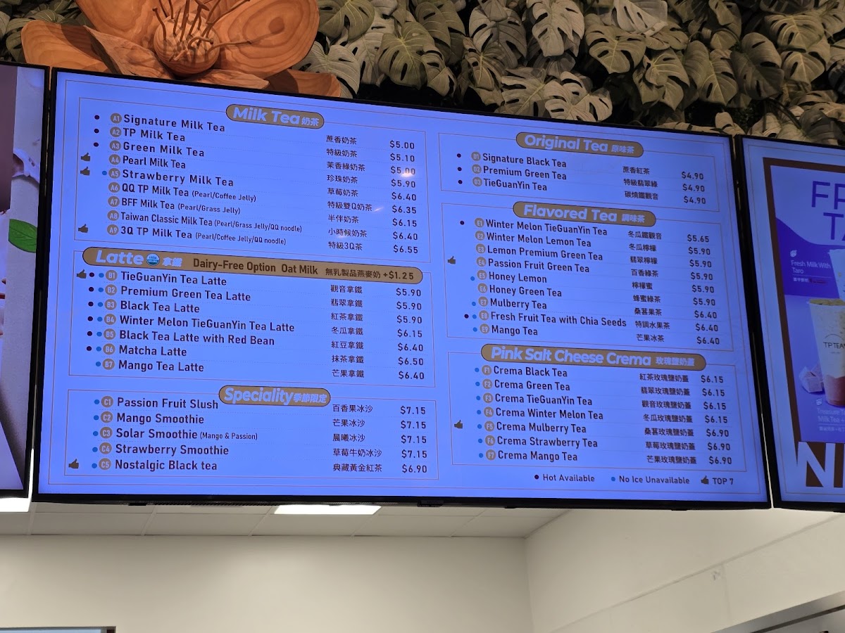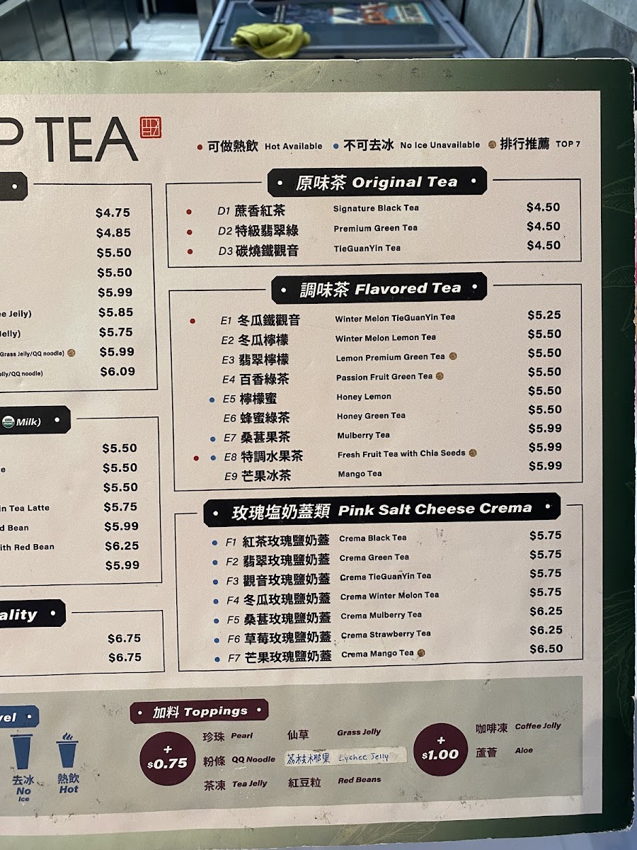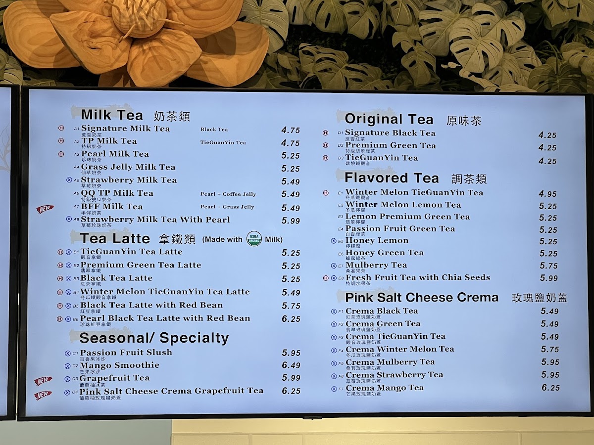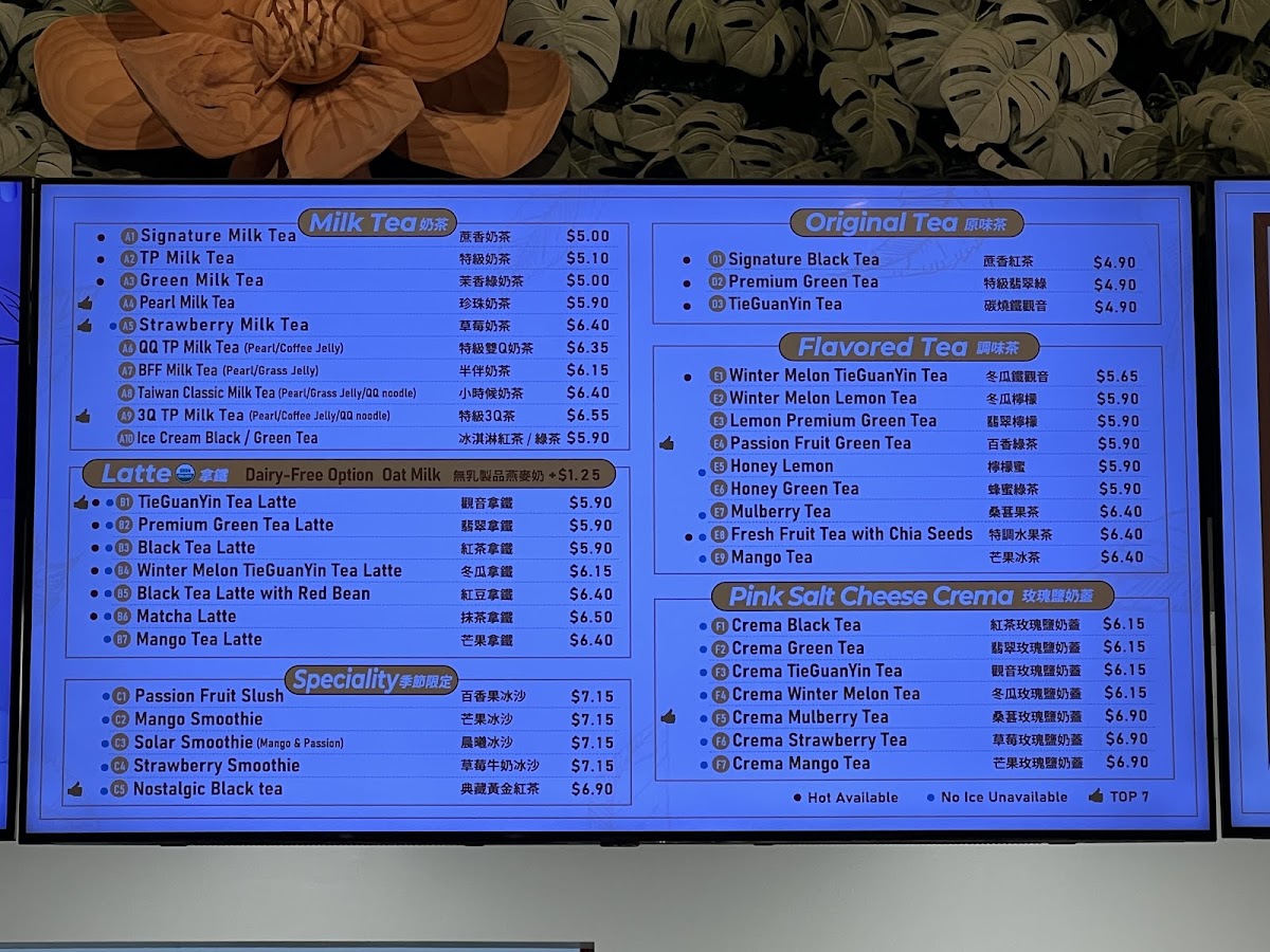 The menu at Tp Tea in Seattle offers an impressive variety of teas, from refreshing fruit-based blends to creamy milk teas and unique specialties. For flavored tea enthusiasts, options like Wintermelon TGY Tea ($4.50), Mulberry Tea ($4.00), and Passion Fruit Tea ($4.50) bring a delightful range of flavors, while the Osmanthus Lemon Glow with Golden Jelly ($5.00) stands out with its sweet and fragrant touch. Milk tea lovers will enjoy the rich, indulgent offerings such as MT 蔗香奶茶 ($4.50), 3Q TP MT ($5.00), and Taiwan Classic MT ($4.00), each with their own unique sweetness and texture. For those seeking something a bit more indulgent, the Crema series includes creamy options like BT Crema ($4.50) and Wintermelon Tea Crema ($5.00), providing a luscious, velvety experience. The Signature Black Tea ($3.50) and TieGuanYin Tea ($4.00) are perfect for those who prefer classic, bold flavors, while the Nostalgic Black Tea ($5.00) evokes memories of traditional tea-drinking. Additionally, the Tea Latte section features comforting choices like the TGY Tea Latte ($5.00) and Matcha Latte ($5.00), which provide smooth, frothy options for a more indulgent tea experience. Whether you're looking for something light and fruity or rich and creamy, Tp Tea offers a diverse and flavorful selection for every tea lover.